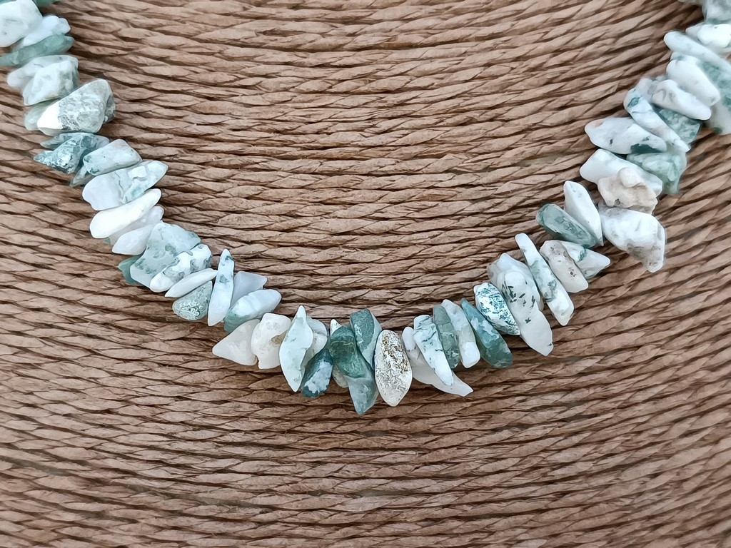 Ogrlica od poludragog kamena mahovinastog Ahata. Kristalići su bijelo-zelene boje, grublje obrade bez sjaja ali su jako ugodni na koži.
