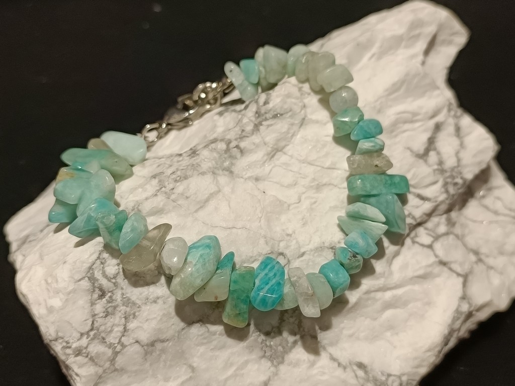 Jednostavna narukvica napravljena od poludragog kamena Amazonita. Kristali su obrađeni u obliku čips-kamenčića raznih nijansi, od svijetle do intenzivne zelenkasto-plave. Narukvice imaju produžni lančić te su prilagodljive duljine. Kopčaju se na standardnu karabin kopču. U “Kutku za radoznale” pogledajte ezoterično značenje i ljekovito djelovanje ovog minerala. Lotosova izrada nakita od poludragog kamenja, raznih modela za vrlo povoljne cijene.