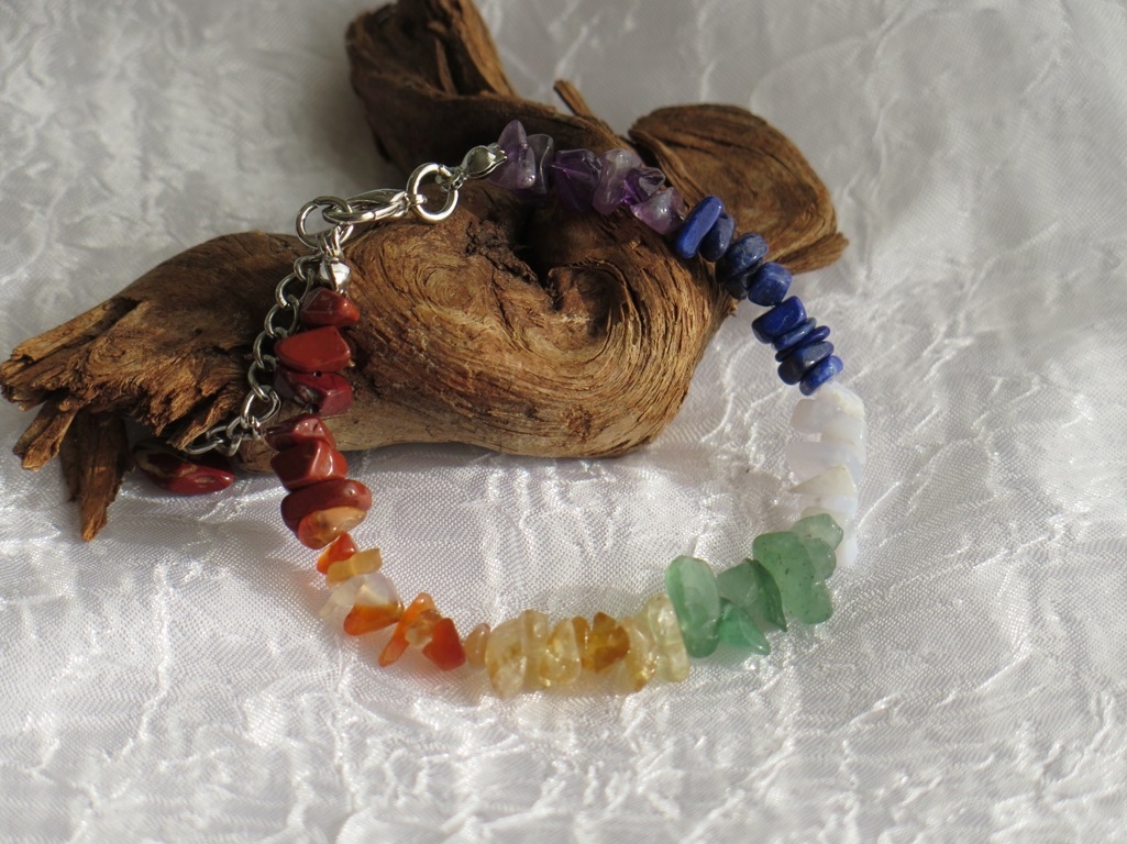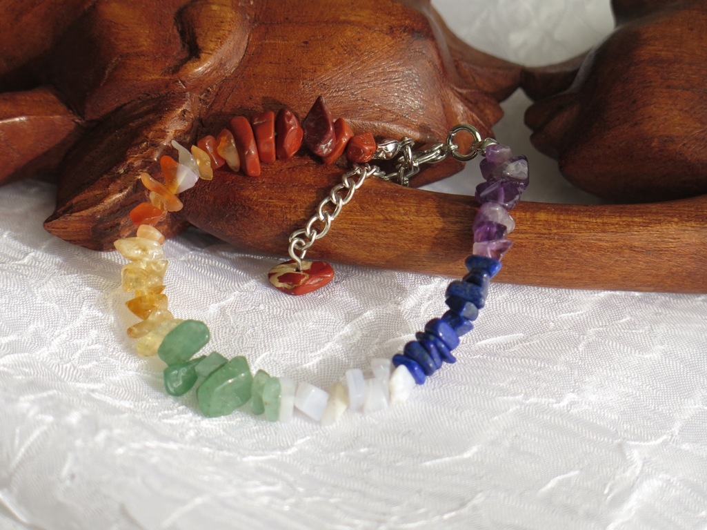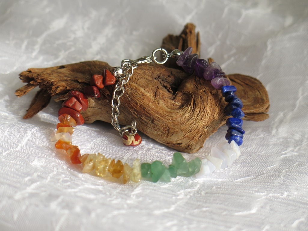 Čakra narukvica sastavljena je od sedam vrsta poludragih kamena za sedam energetskih centara – čakri. Kameni korišteni u izradi narukvice mogu biti slijedeći : crveni Jaspis, Hematit, Granat, Opsidijan, Koralj, Karneol, Dimni kvarc, Ahat, Citrin, Tigrovo oko, zeleni Aventurin, Rozenkvarc, Epidot, Rodonit, Kalcedon, Tirkiz, Lapis Lazuli, Sodalit, Ametist, Howlit i Gorski kristal. Mi ćemo složiti kristale po svom izboru za svaku čakru. Kristali su čips nepravilnog oblika, različite veličine i nijansi boja. Zakopčava se na karabin kopču, a pomoću regulativnog lančića dužinu možete podesiti upravo po svom ukusu. Primjerak koji vam isporučimo ovisno o kristalima će biti drugačiji od prikazanog, ali po istom modelu. Na našoj online prodaji potražite kvalitetan energetski nakit za svaki dan po pristupačnim cijenama. Više o ovim mineralima saznajte u Kutku za radoznale.