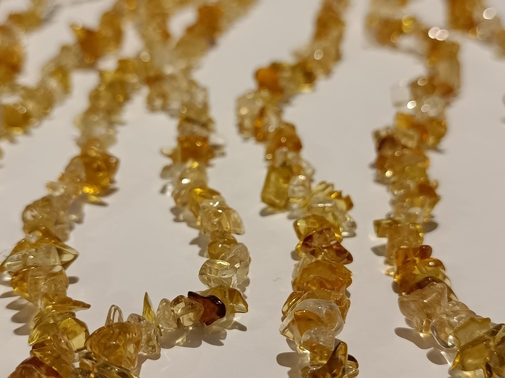 Ako želite kod kuće izraditi predivan nakit ili neki ukras za Vaše najmilije, učinite to s niskom od termo-obrađenog poludragog kamena Citrina. Čips perle su nepravilnog oblika, različite veličine, oblika i božanstveno transparentno-žutih nijansi boja. Na našoj online prodaji možete pronaći raznovrstan repromaterijal i ukrasne elemente po dobrim cijenama. S obzirom na to da se radi o kristalu prirodnog porijekla svaki komad se razlikuje, a mi ćemo vam na željenu adresu isporučiti najljepši komad koji imamo na raspolaganju.