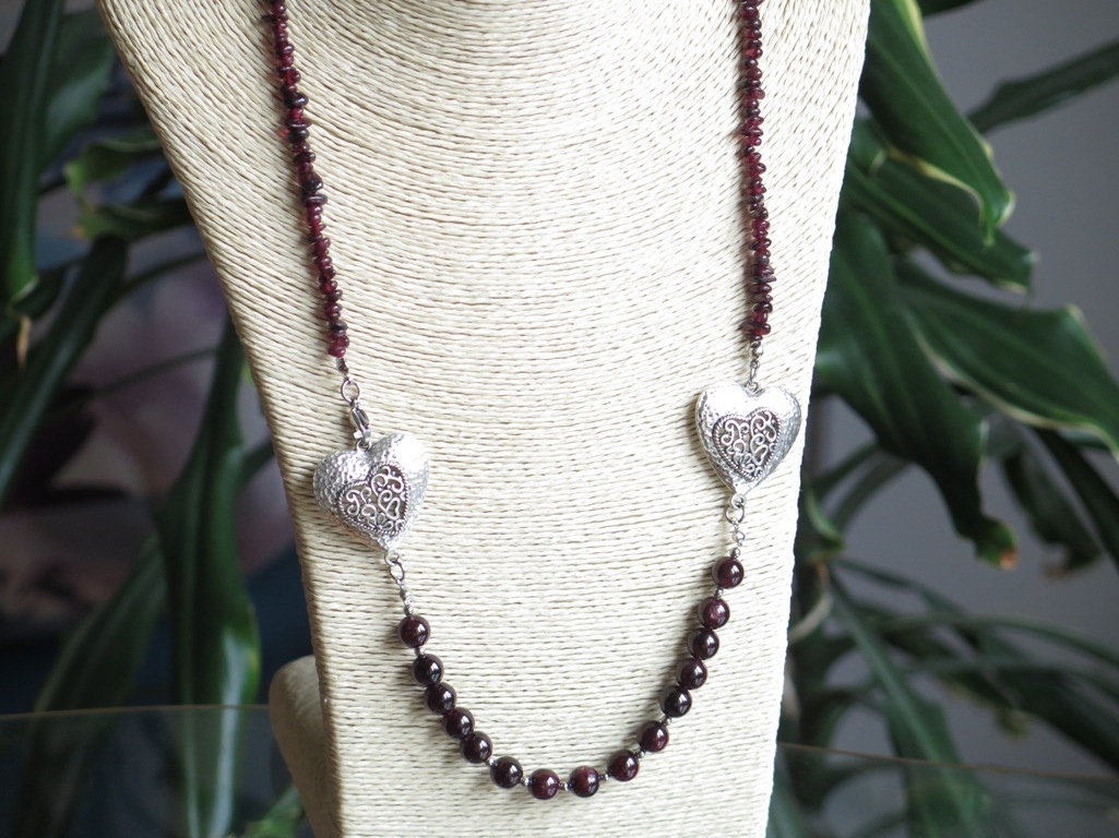 Lijepa ogrlica izrađena od brušenih kuglica poludragog kamena Granata i kamenčića u obliku čips ulomaka. Ukrašavaju je dva metalna dijela od tibetanskog srebra u obliku srca, koji ostavljaju dojam starinskog izgleda. Zakopčava se karabin kopčom od nehrđajućeg čelika. Bordo boja ovog prekrasnog kristala označava magičnu moć ljubavi i strasti, čiste i nevine ljubavi. Prodajemo nakit od raznih vrsta poludragog kamena, naše ručne izrade, kojeg možete naručiti putem našeg online kataloga. Lotos Vam nudi dobru kvalitetu i povoljnu cijenu.