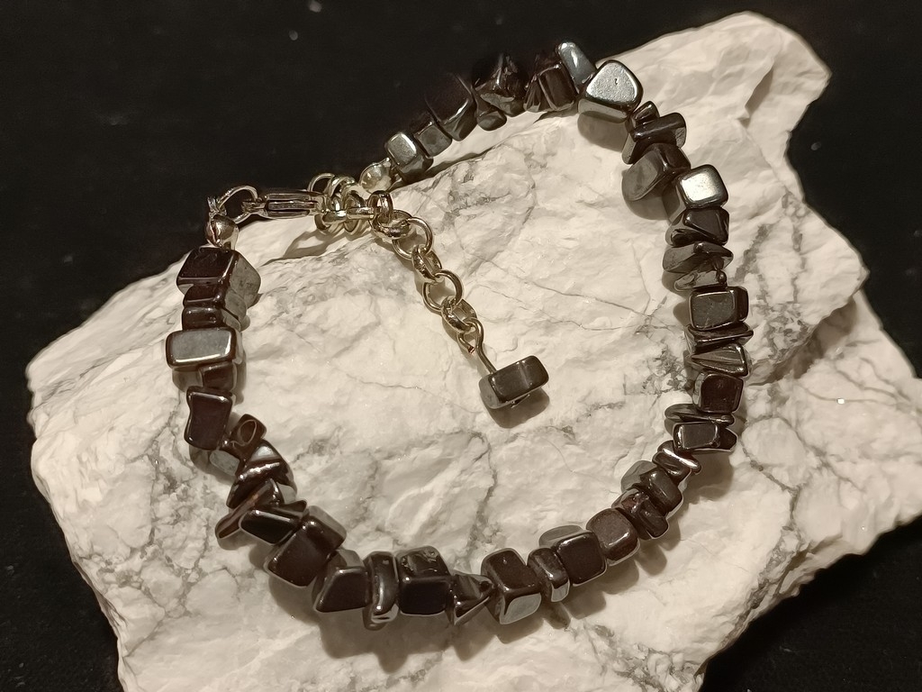 Prikazana narukvica izrađena je od poludragog kamena Hematita. Njegovi kristali su nepravilne obrade, drugačijih dimenzija te tamno sivih, skoro pa crnih boja. Glatko su polirani pa se lijepo presijavaju. Zakopčava se na klasičnu karabin kopču dok s produžnim lančićem duljinu možete prilagoditi vlastitoj želji. Možemo ju izraditi i na dvostrukoj elastičnoj gumici, no to morate napisati u bilješkama prilikom naručivanja. Plodove našeg ručnog rada pogledajte na online katalogu. Kupiti ga možete i preko internetske prodaje po odličnoj cijeni. Mi ćemo u najkraćem mogućem roku isporučiti najbolji komad koji nam je na raspolaganju. On se u veličini ili izgledu kristala može razlikovati od ovdje prikazanog. Ovo je mineral koji simbolizira sreću, uspjeh i snagu.