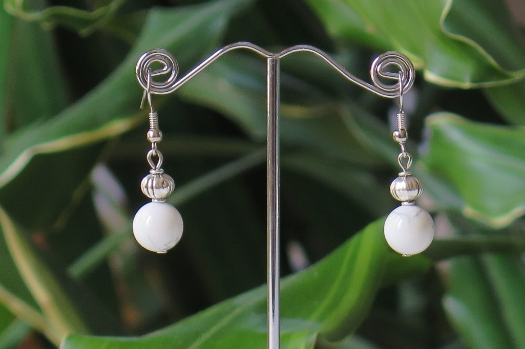 Nakit od poludragog kamena Howlita svakoj odjevnoj kombinaciji daje instantni izgled elegancije i uzvišenosti. Upravo takve su i ove naušnice koje smo za Vas ručno izradili u našoj trgovini. Spojili smo kuglice ovoga kristala i male izrezbarene perlice od tibetanskog srebra te stvorili jednostavan, a efektan stil. Ako Vam je draža neka druga vrsta kopčanja od udica, možete ih naručiti i sa završetkom u obliku igle, klipse ili klapa (udice zatvorenog tipa). Svaka perla će se u detaljima razlikovati od ostalih, zbog prirodnog porijekla minerala. Poslati ćemo Vam isti model sa najsličnijim primjercima. Brojna online prodaja kvalitetnih proizvoda za dostupne cijene.