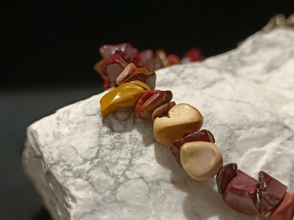 Jaspis mookait poludragi je kamen koji pročišćava krv, aktivira rad slezene i jetre, te liječi kožne alergije. Od njega smo ručno izradili ovu šaroliku narukvicu.