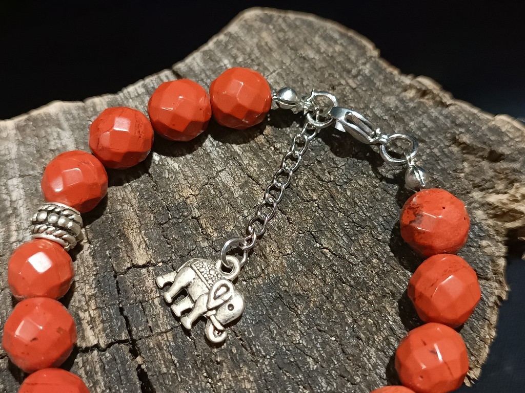 Prikazana narukvica izrađena je od crvenog Jaspisa. Kristali su obrađeni u obliku facetiranih kuglica, lijepih su ciglastih boja i sjajnih tonova. Ukrašavaju je metalni elementi od tibetanskog srebra. Kopča se na klasičnu karabin kopču od nehrđajućeg čelika. On kao ni produžni lančić ne sadrži nikal. Ovaj ures nastao je ručnom izradom naše kreatorice nakita. Lotosova online prodaja nudi lijepe modele poludragog kamenja, dobre kvalitete, za pristupačne cijene. Svaki komad drugačijih je nijansi boja, stoga ćemo vam poslati najljepšu narukvicu koju imamo na raspolaganju.