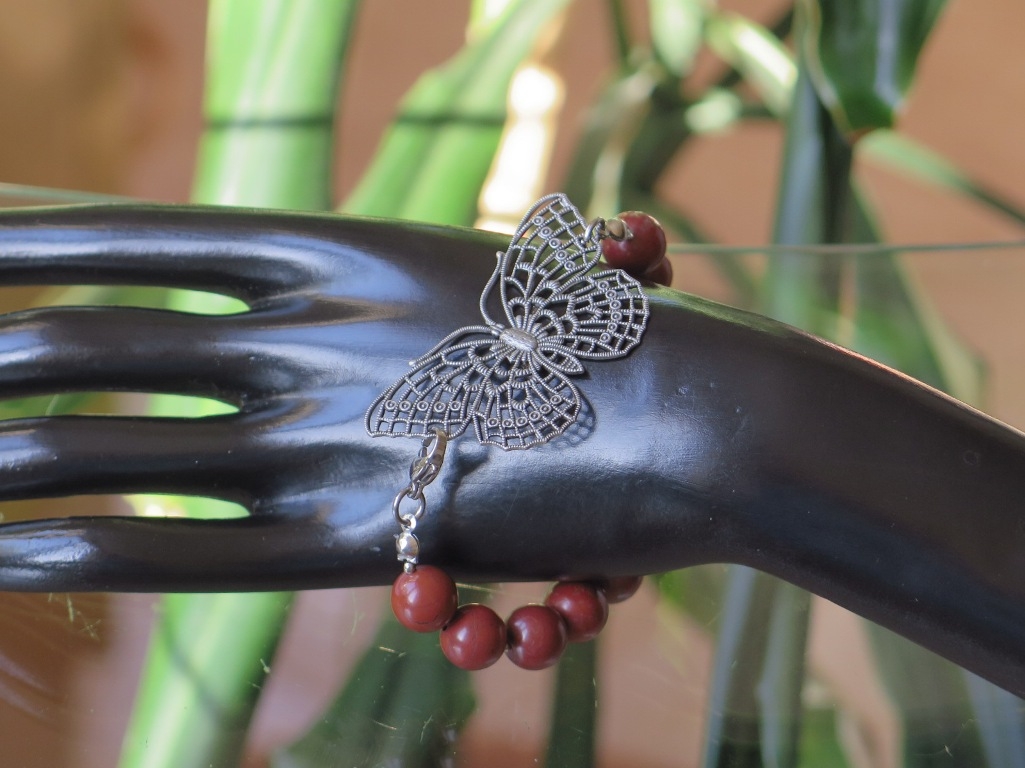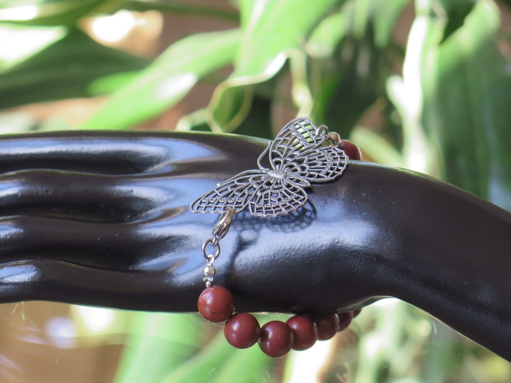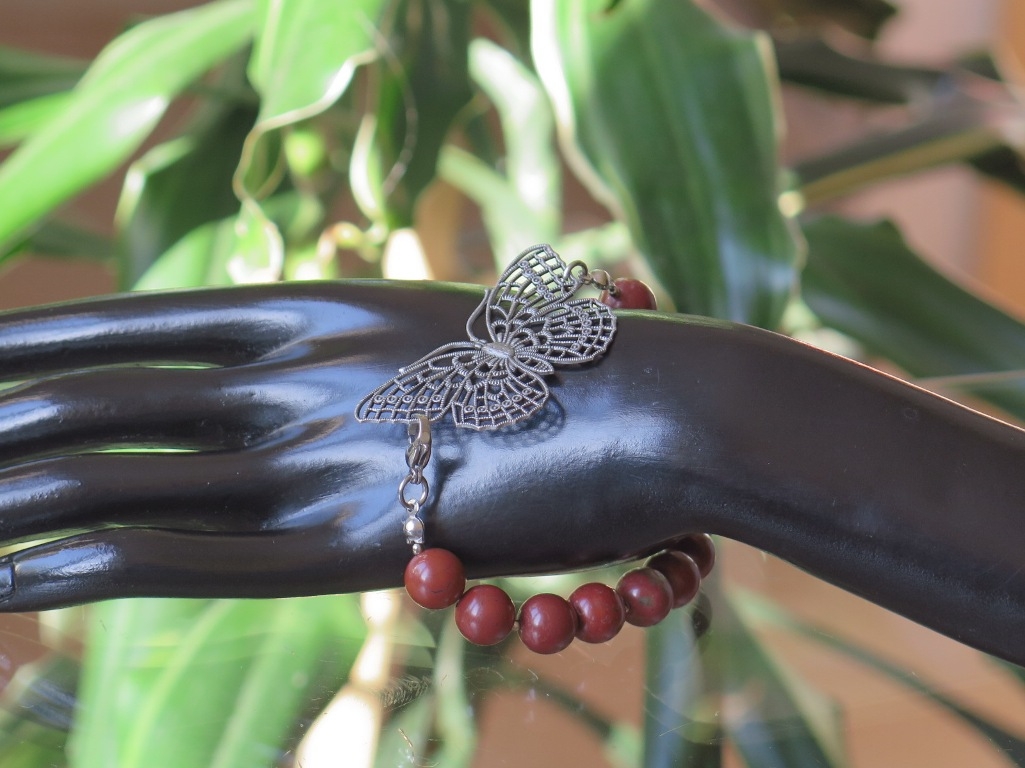 Poludragi kamen crveni Jaspis poslužio nam je da kreiramo ovu predivnu narukvicu. Njegove tamno-crvene, glatko obrađene kristale spojili smo s ukrasnim leptirom sivog sjaja. Na ruku se stavlja s klasičnom karabin kopčom koja u sebi ne sadrži nikal jer je načinjena od nehrđajućeg čelika. Ovaj ručno izrađeni komad savršeno će upotpuniti svaku Vašu odjevnu kombinaciju, a pri tome će joj dati dozu svježine i elegancije. Putem naše online prodaje, po pristupačnim cijenama, naručite predivne primjerke nakita koje su djelo naše dizajnerice. Svaka perla ima sebi svojstven izgled, nijanse boja i šare te se radi toga može razlikovati u tim detaljima od ovdje prikazane. Uvijek ćemo kreirati isti model s najboljim komadima koji su nam na raspolaganju.