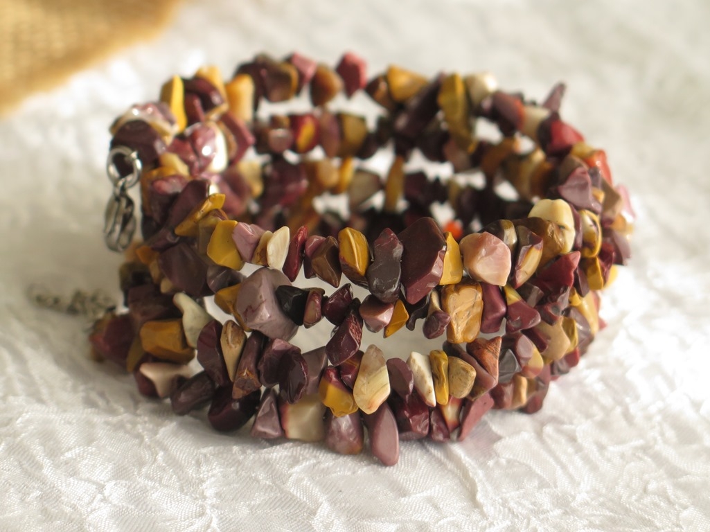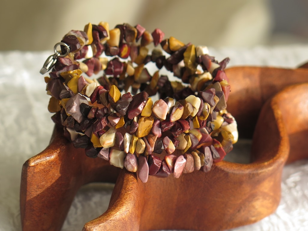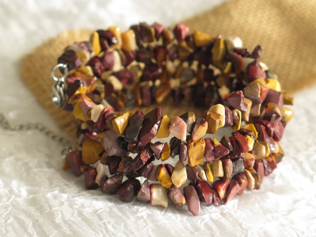Ova predivna narukvica poludragog kamena Jaspisa Mookaita napravljena je od čipseva (kristala) , šarolike boje. Minimalni unutarnji promjer iznosi 18 cm. Nanosi se jednostavno na zapešća a završava s klasičnom kopčom i produžnim lančićem. Iskoristite pogodnosti online prodaje i naručite raznolik nakit za sebe i drage Vam osobe po pristupačnim cijenama. Zbog svoje prirodnosti svaki kamen različitih je nijansi boja. Više podataka o ovome mineralu naći ćete na priloženim poveznicama.