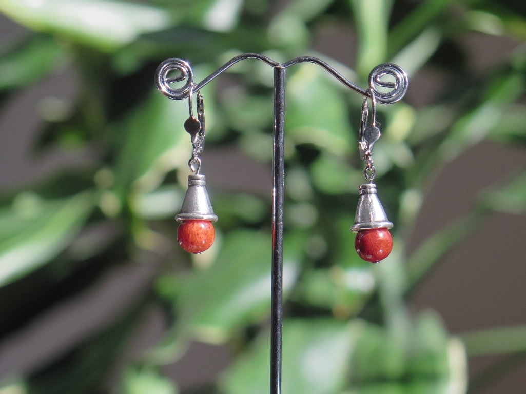 Lijepe naušnice načinjene su od spužvastog crvenog Koralja i tibetanskog srebra. Perle su glatke obrade, lijepih boja i sjajnih tonova, a iznad njih je ukrasni element u obliku zvona.