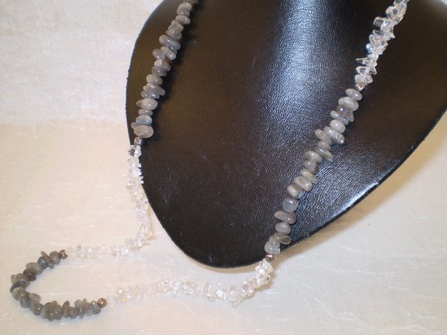 Poludragi kameni Labradorit i Gorski kristal spojili su se u ovu privlačnu ogrlicu. Naizmjenično su slagani jedan za drugim od nepravilnih komadića različitog loma i izgleda. Maslinasto-zelene boje sa sivkastim i plavičastim tonovima te prozirne nijanse vladaju ovim suvremenim komadom. Njezin razigran izgled čini ju drugačijom od drugih, a opet se lako može kombinirati uz ostale komade nakita. Kopča je izrađena od nehrđajućeg čelika koji ne sadrži nikal. Od istog materijala dodan je i produžni lančić s kojim duljinu možete regulirati. Svaki kristalić drugačije je veličine i nijansi boja i shodno tome uzorak koji primite neće biti isti kao što je naslikano. Svakako isporučit ćemo isti model kreiran od najboljih perli s kojim raspolažemo. Tu također pogledajte ostale ornamente ručne izrade koje prodajemo za povoljne cijene.