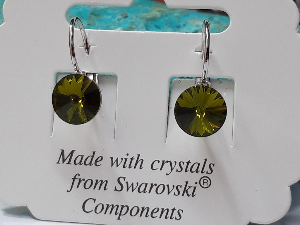 Zeleno-maslinaste naušnice od Swarovski kristala širine 8 mm, prozirno-sjajnih i prelijevajućih tonova. Navlače se na klap (udicu zatvorenog tipa s osiguračem). Napravljene su od antialergijskog materijala, bez nikla, prevučenog i zaštićenog s Rodijem. Zdravstveno su ispravne. Vrlo su lagane. Izradila ih češka firma L&S Bohemia s.r.o. koja je autorizirani proizvođač i distributer ženskog nakita od Swarovski komponenata. Pogledajte naš online katalog nakita po pristupačnim cijenama.