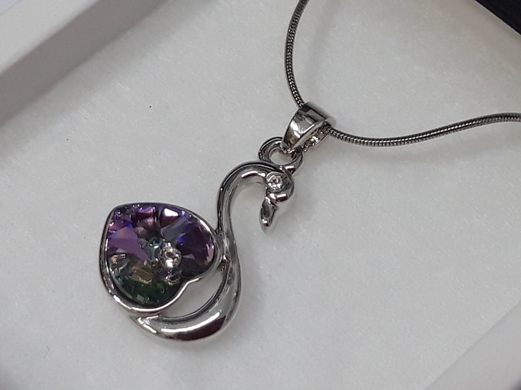 Ogrlica od Swarovski Elements s lijepim privjeskom u obliku labuda. U njegovom središnjem dijelu je Swarovski kristal u obliku srca veličine 10×10 mm. On je ljubičasto-prozirnih boja (Vitrail Light) i prelijevajuće-sjajnih tonova. Ures je ovješen na finom srebrnom lančiću širine 1 mm, te je prilagodljive duljine zbog dodatka niza alkica na njegovom samom kraju. Zakopčavanje je na klasičnu kopču karabin forme. Načinjen je od antialergijskog metala koji ne sadrži nikal, te je zaštićen Rodijem. Ovaj zanimljivi i profinjen ženski ornament dizajnirala je češka firma L&S Bohemia koja je ovlašteni proizvođač nakita od Swarovski komponenata. Artikal je pakiran u crno-bijeloj kutijici s certifikatom. Kupite ju putem Lotosove online prodaje gdje Vas čeka još mnoštvo prelijepih modela po povoljnim cijenama.