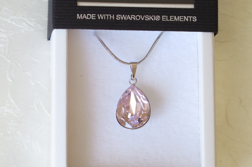 Ogrlice od Swarovski kristala s privjescima veličine 22×13 mm. Obješeni su na srebrnom lančiću debljine od 1,5 mm, koji je prilagodljive duljine. Swarovski kristali su svijetloružičastih boja i prozirno-prelijevajuće-sjajnih tonova. Ogrlice su napravljene od kvalitetnog antialergijskog metala, bez nikla, koji su prevučeni s Rodijem. Vrlo su lagane i zakopčavaju se na karabin kopču. Nakit od Swarovski Elements kreirala je češka tvrtka L&S Bohemia koja je ovlašteni proizvođač nakita od Swarovski elemenata. Pakiranje je u crno-bijeloj kutijici s uputama za uporabu. Bogati izbor ogrlica na online katalogu Swarovski Elements nakita za vrlo povoljne cijene.