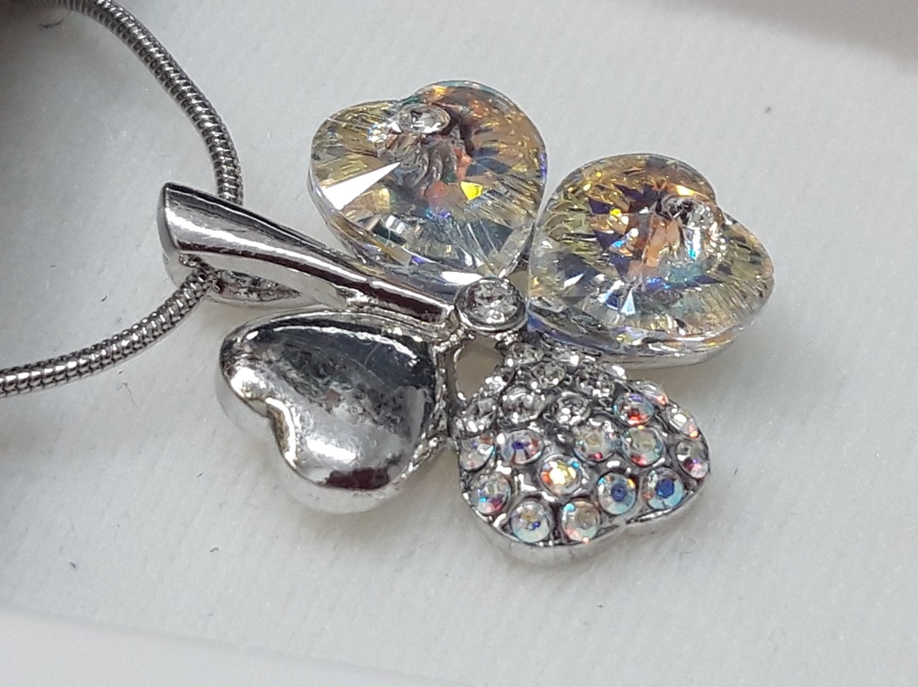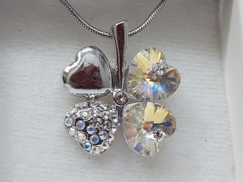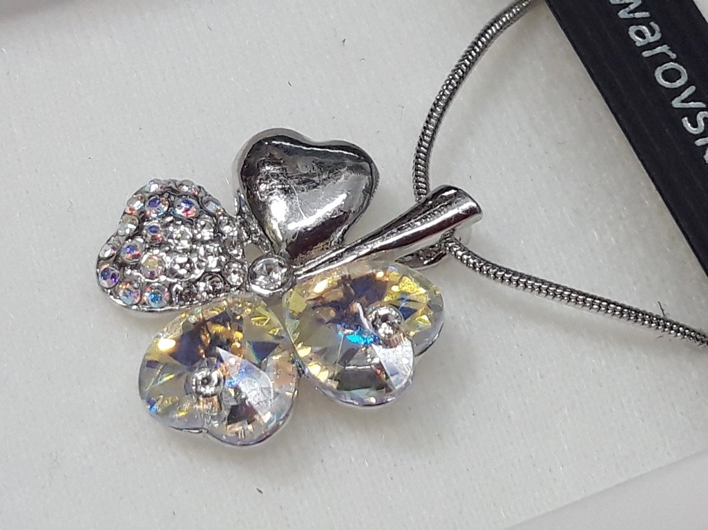 Online prodaja Swarovski ogrlice obliku cvijeta, kristalno-žutih-prelijevajućih i srebrnih boja. Ures sadrži regulativni lančić za podešavanje duljine širine 1,5 mm. Privjesak je izrađen od četiri srca, ukupne veličine 25 x 22 mm. Zakopčava na karabin kopču. Svi metali su izrađeniod antialergijskog materijala, zdravstveno ispravni, te zaštićeni s plemenitim Rodijem. Ovaj lijepi ornament je napravila češka firma L&S Bohemia, koja je ovlašteni proizvođač ovog poznatog ženskog nakita. Pakiran je u lijepoj crno-bijeloj kutiji sa uputama. Možete ga kupiti na stranicama Lotos web kataloga za pristupačnu cijenu.