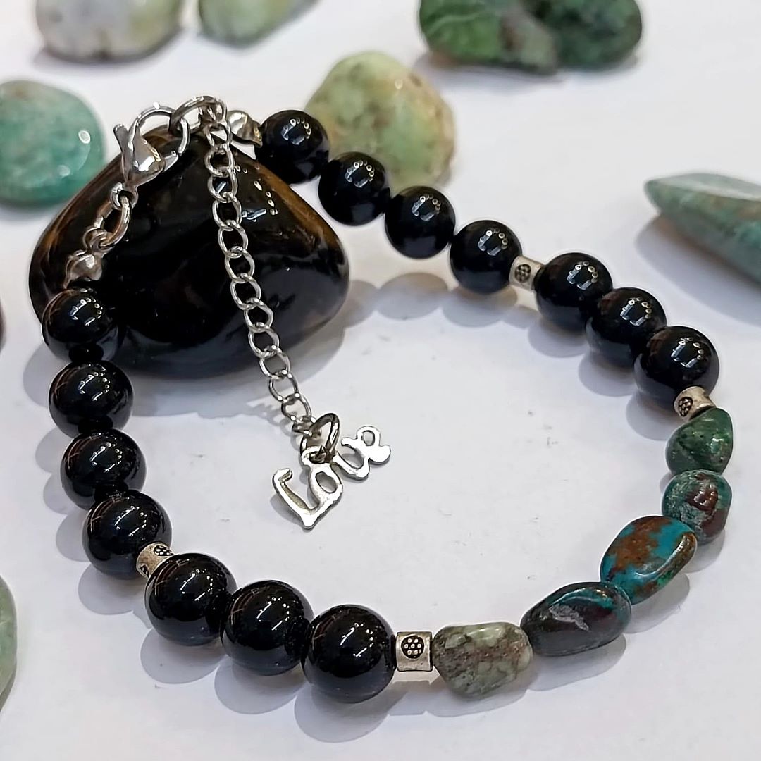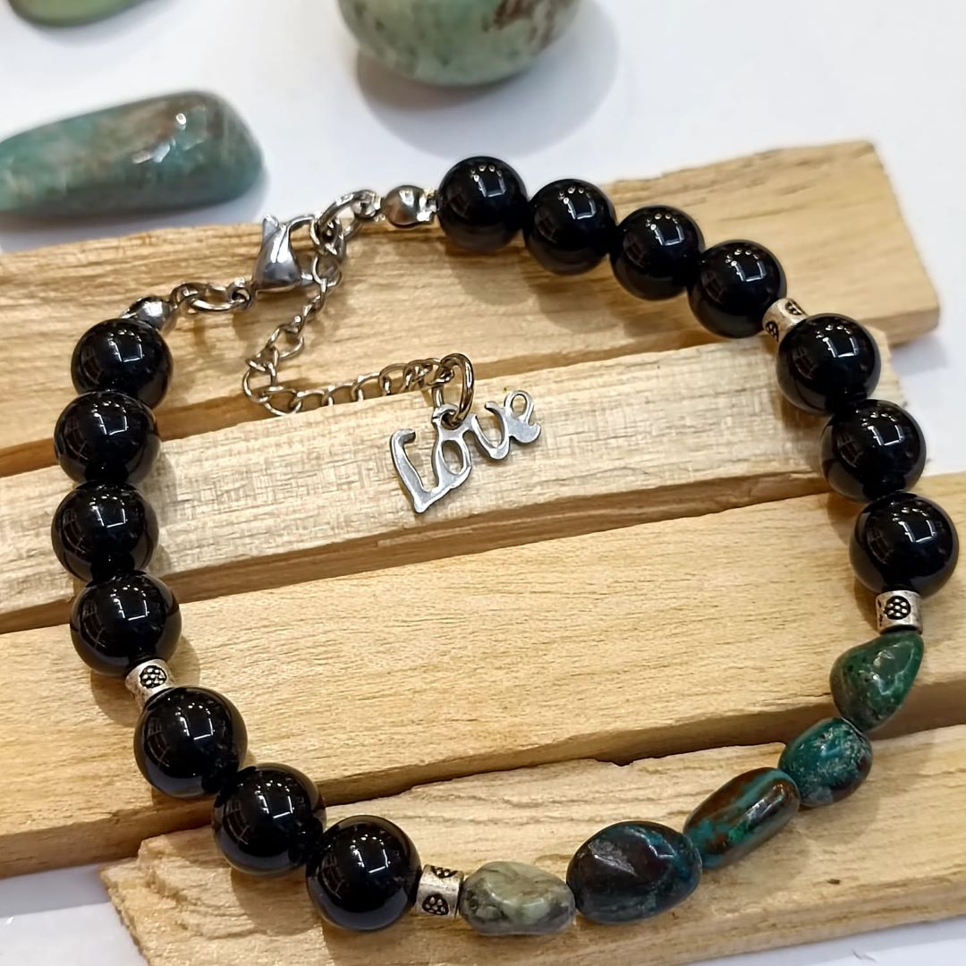Ručno izrađena narukvica od poludragog kamena Oniksa i Krizokole. Glatko obrađene sjajne perle Oniksa nanizane su na duplu elastičnu gumicu, a dodana su i tri kamenčića Krizokole. Sve je upotpunjeno s četiri ukrasne perle. Zbog svoje izvedbe ovo je ures koji se lako nosi svaki dan. Vrlo je nosiva i kao ženski i kao muški nakit. Kači se karabin kopčom od nehrđajućeg čelika.