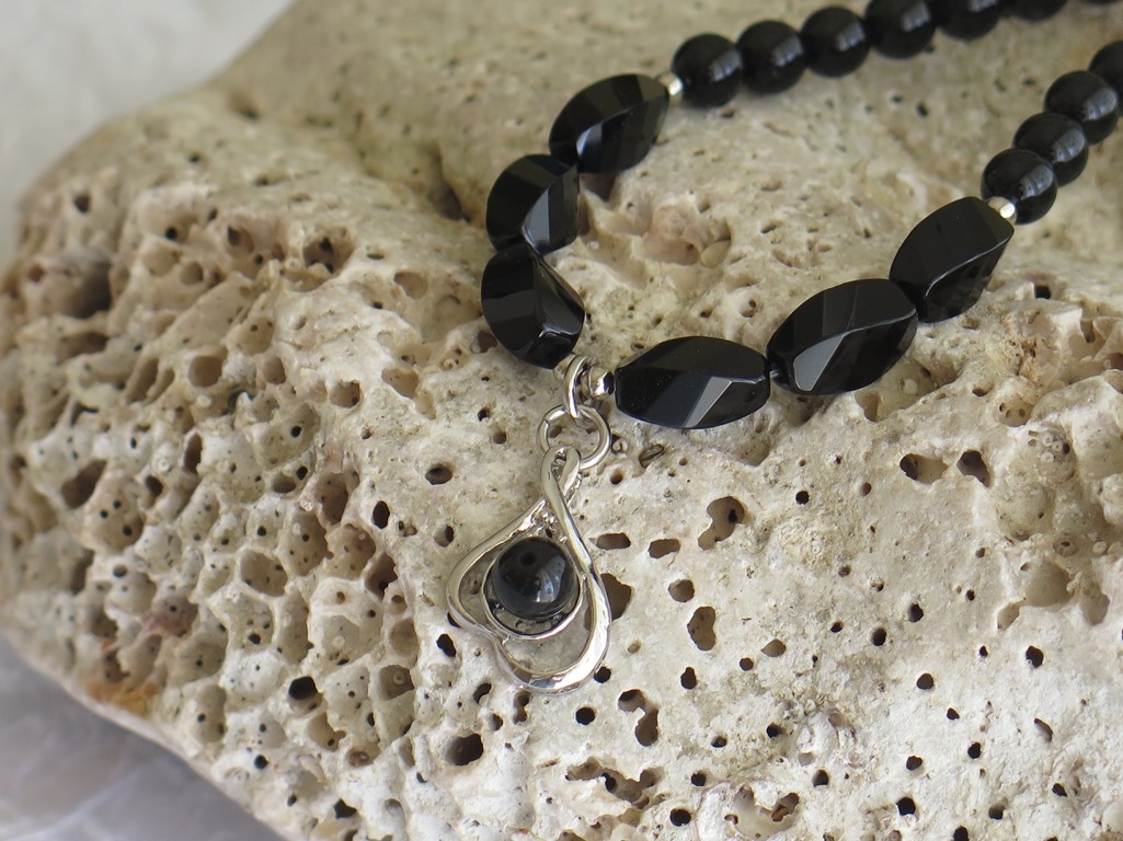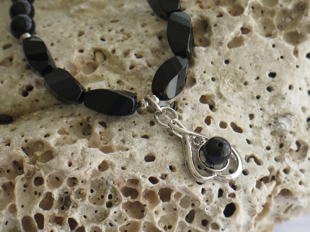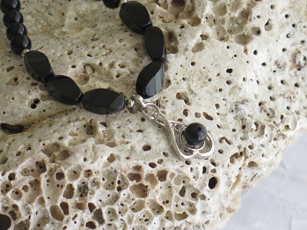 Zanimljiva ogrlica ručno izrađena od moćnog poludragog kamena Oniksa. Kristali su kombinacija okruglih i nepravilnih perli visokoga sjaja. Kopča se pomoću standard karabin kopče s dodatkom produžnog lančića. Cjelokupni ures upotpunjuju malene komponente srebrne boje. Ovaj kamen se smatra voditeljom k duhovnoj zrelosti i kontroli nepoželjne energije te pojačava imunitet. Nudimo široki asortiman raznih modela ženskog nakita s poludraguljima za super cijene na Lotos online prodaji.