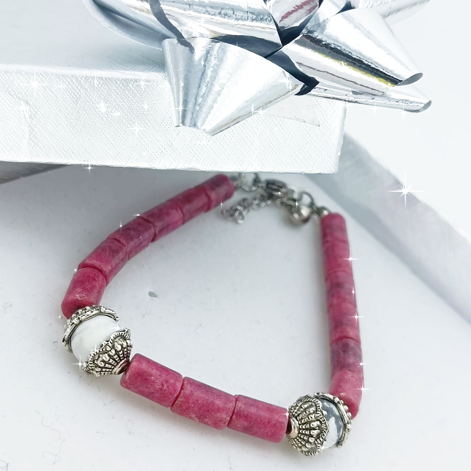 Lijepa narukvica na slikama je izrađena od kristala Rodonita i bijelog Howlita. Valjkasto brušene perle su tamno roze boje. Kači se antialergijskom karabin kopčom, bez nikla. Između smo ubacili dekorativne elemente. Minimalni unutarnji obujam joj iznosi od 16 – 18 cm. Veliki izbor nakita možete vidjeti na našem online katalogu. Putem njega kupite unikatne modele za povoljne cijene. Poslat ćemo Vam najljepši primjerak s kojim raspolažemo u trgovini. “U Kutku za radoznale” pročitajte ezoterična značenja i ljekovita djelovanja ovog poludragog kamena koji njeguje ljubav i potiče bratstvo i humanost.