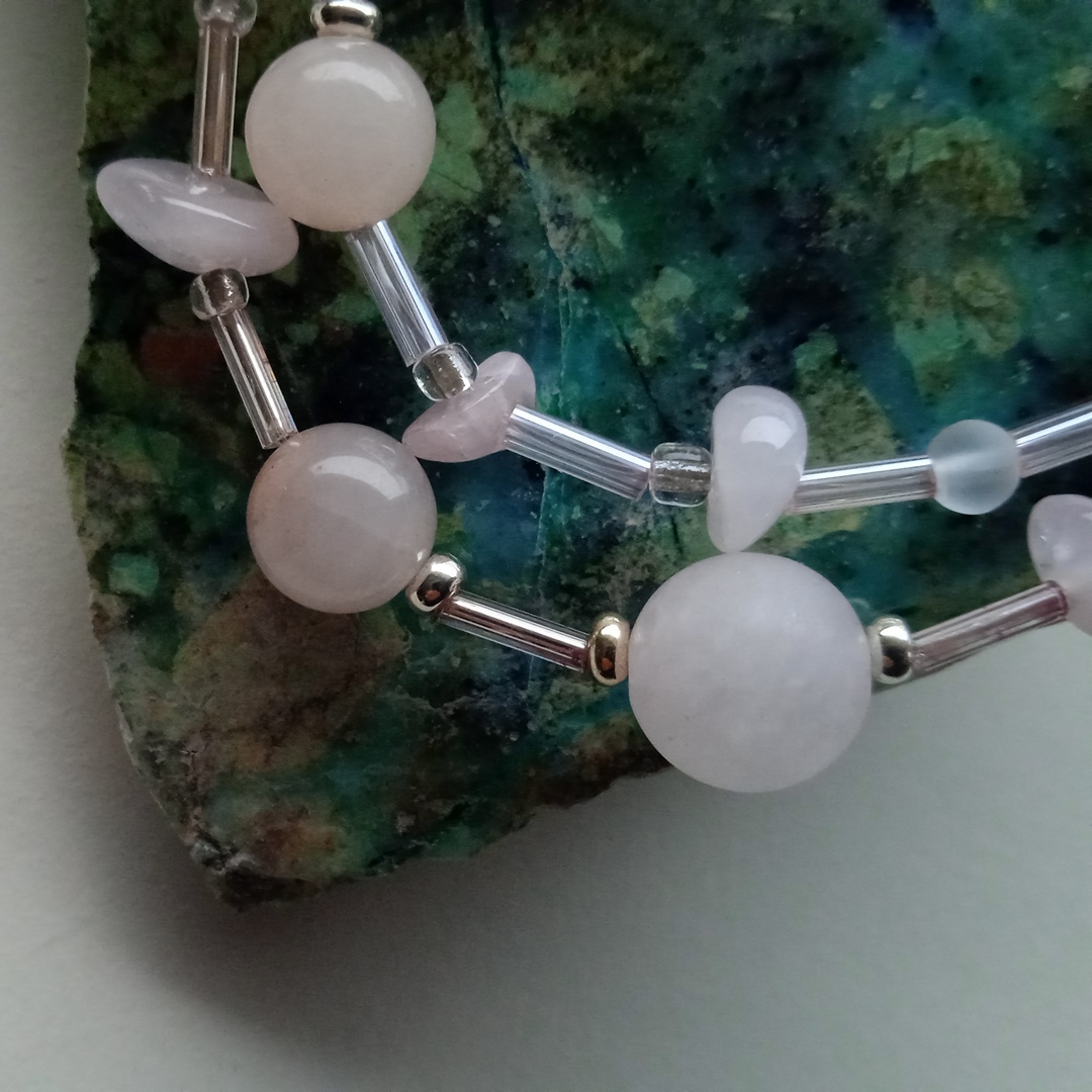 Prekrasna narukvica načinjena od poludragog kamena Rozenvarca, metalnih komponenti i staklenih perli.