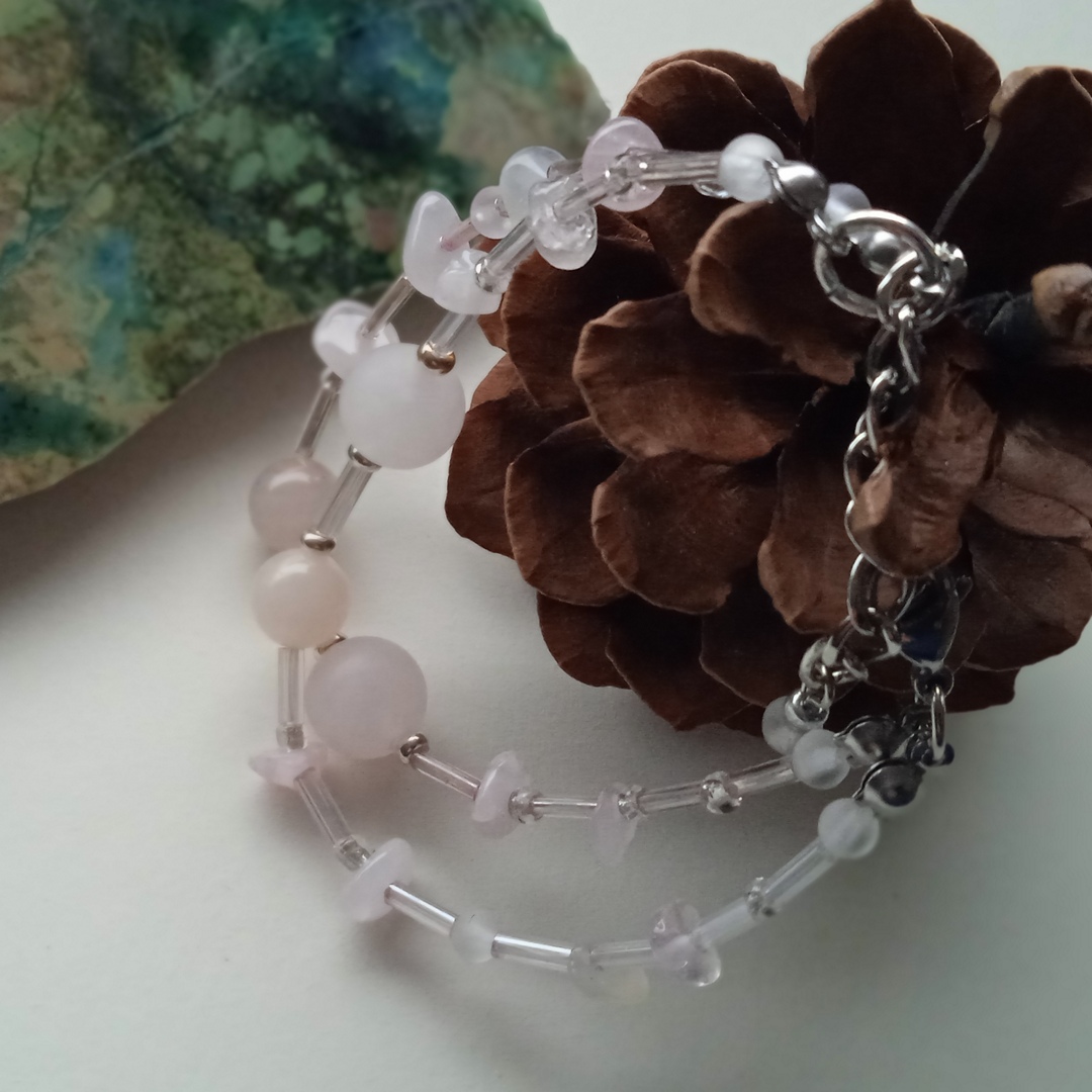 Dvostruka narukvica savršeno ukomponiranih boja poludragog kamena Rozenkvarca i staklenih perli nanizanih na flaks. Duga je 17 cm s dodanim produžnim lančićem kako bi svima pristajala, a kopča se s standardnom karabin kopčom nehrđajućeg čelika. Primit ćete upravo nakit kojeg vidite na slikama. Više podataka o ovim prirodnim kristalima možete naći pretraživanjem u “Kutku za radoznale“.