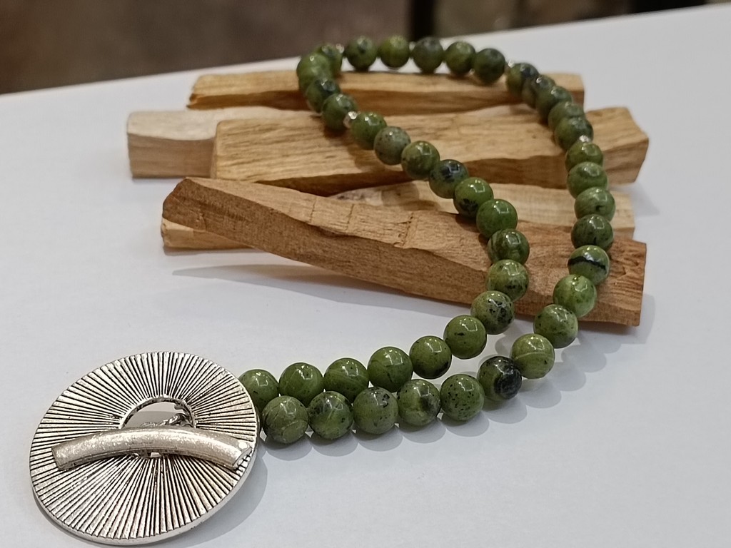 Ogrlica koje je kvalitetno izrađena od poludragog kamena Žada. Njemu duguje svoje ugodne tamnozelene zelene nijanse boja sa prepoznatljivim šarama.